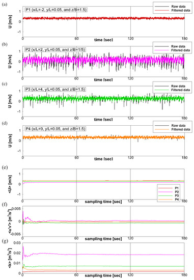 (a–d) Streamwise velocity time series before and after the postprocessing of the velocity measurements. Temporal convergence study: (e) the streamwise velocity, (f) the primary Reynolds shear stress, and (g) the turbulence kinetic energy averaged over progressively increasing sampling times. P1, P2, P3, and P4 are defined by , and 9 at invariant (nearest point to the lateral side wall) and (at the turbine center height).