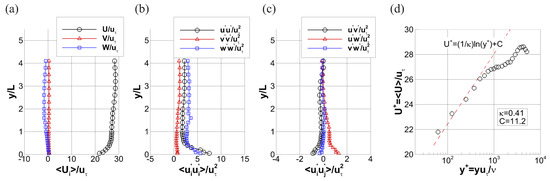 Incoming flow statistics along the spanwise direction at : (a) mean velocity, (b) Reynolds normal stresses, (c) Reynolds shear stresses, and (d) log-law parametrization of the lateral boundary layer.