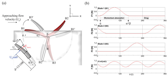 - The flow momentum and drag force exerting on the first blade () is calculated as a function of the phase angle ; the forces on the second () and the third blade () were obtained shifting by and , and , respectively. Here , assuming the backside of the turbine blade resembles a flat plate [34], and are calculated based on the geometry of the turbine system. The resulting force on the first blade is