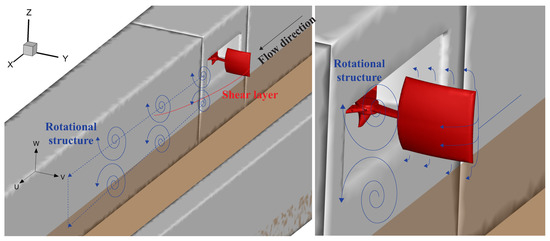 Figure 8b,e shows the vertical velocity contours. A pair of vortical flow structures is recognized. At (Figure 8b), upward and downward motions are identified in the vertical plane, near the side wall and in the plane close to the exposed blade tip, respectively, suggesting that the flow rotates in the counter-clockwise direction (when looking downstream). On the other hand, downward and upward motions are observed along the side wall and along the exposed tip at (Figure 8e), suggesting the flow rotates in the clock-wise direction. These two signatures suggest the existence of a counter-rotating vortex pair. As drawn in Figure 7, a pair of rotational structures develop due to the different direction of flow entrainment around the turbine blades, sustained by higher velocity bypassing the side edge of the blade as compared to the flow over the top and bottom edges of the blade. These rotational structures, as they are advected downstream, are found to expand in the radial direction, i.e., the outward-facing direction from the axis of the rotational structures (x axis) in the cross-section plane (y-z plane). A footprint of this expansion is plotted in Figure 9e, showing the Reynolds shear stress contours of . The direction of is inferred to determine the sign of : at , is dominant, which implies that the flow structures are likely to move downwards along the vertical direction, contributing to the enhancement of wake recovery [39]. The layer of streamwise velocity at (Figure 8d) expands toward the left side of the channel (when looking downstream), as faster wake recovery occurs due to the vertical advection from the expanding rotational structures.