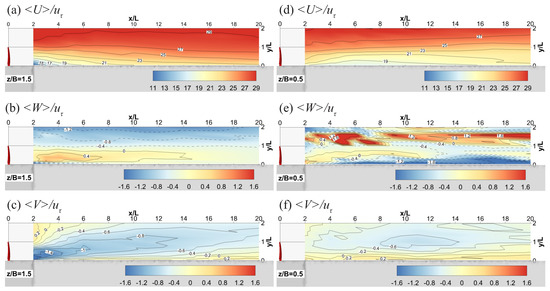 Dimensionless mean flow velocity contours at (blade center height (a–c) and (the midpoint between the bottom edge of the blade and the channel bed (d–f)).