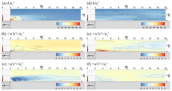Dimensionless turbulence characteristics contours at (blade center height, (a–c)) and (the midpoint between the bottom edge of the blade and the channel bed, (d–f)).