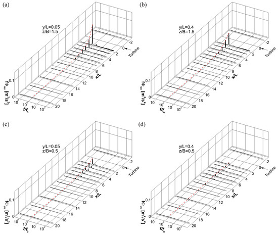 Periodic motions in the wake of the turbine and their relationships with the mean wake structures are discussed in this section. Power spectra density () function is obtained by calculating the Fourier transform pair of the autocorrelation function of the fluctuating velocity components. Premultiplied spectra () is used to detect the dominant frequency responsible for a large amount of turbulence kinetic energy production, and track its decay along the x direction. Figure 10 shows the premultiplied spectra of u-velocity, where is the blade passing frequency that corresponds to the rotational speed of the turbine shaft [rev/s] multiplied by the number of blades. An intriguing finding is that peaks at the blade passing frequency are detected up to = 7–9. at the blade center height in this experiment (Figure 10a,b). The result is somewhat different from earlier experiment studying a lift force-driven vertical axis turbine. Ouro et al. [22] conducted experiments with three-bladed Gorlov-type vertical axis hydrokinetic turbine and measured velocity in the wake of the turbine using ADV. They reported that peaks at the blade passing frequency are only observed upto (within near-wake), where D is the diameter of the turbine rotor, and the peaks are induced by the dynamic stall vortices emitting from blades. The discrepancy implies that tip vortices shed by blades are not the only factor causing the energy peaks of the streamwise velocity in this experiment. Unlike a lift force-driven vertical axis turbine, the turbine introduced here has more significant periodic blocking effects by blades. The blocking effects deflect the incoming flow momentum and induce a velocity deficit region downstream of the exposed blades when (Figure 5), whereas high momentum flow can freely pass when (Figure 5). This generates seemingly pulsating flows in the wake of the turbine, whose frequency is the same as the blade passing frequency . Note that the energy peaks, despite the small values, persist further downstream at (Figure 10d), as compared to the ones at (Figure 10b) for . It suggests that the pulsating flows advecting the pair of rotating structures discussed above, also affect the unsteadiness of the wake and significantly contribute to the enhancement of the Reynolds stresses.