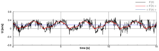To deeply understand the effects of the pulsating flows on the wake turbulence, the triple decomposition suggested by Hussain et al. [40] was applied to the measured streamwise velocity signal. The triple decomposition is a mathematical tool that separates time-averaged (), pulsating (), and fluctuating () velocity components from the velocity signal (). Each components in the triple decomposition are calculated as follows. Equation (6), Equations (7)–(9), and Equation (10) describe how to estimate the time-averaged, pulsating (or wave), fluctuating velocity components, respectively.