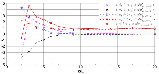 The primary Reynolds shear stress profiles at the lateral wall along the streamwise direction, based on the triple decomposition () and the Reynolds decomposition (), were compared to investigate the effects of periodic pulsating flow characteristics on the lateral wall shear stress. The estimation of the wall shear stress in unsteady flows (e.g., in vegetated channel flows, where periodically shedding vortex streaks) using measured velocity needs some extra caution because most wall shear stress prediction methods in the literature were derived and tested for straight channels with distributed roughness [41]. Duan et al. [42] reported that bed shear stress distributions estimated by the Reynolds shear stresses were able to predict a scour region in the wake of a spur dike in erodible beds (where no logarithmic law parametrization could be assessed). Therefore, we infer that the primary Reynolds shear stress () can be used here to quantify the lateral wall shear stress. Other Reynolds shear stress components ( and ) are ignored as the values are small compared to the primary Reynolds shear stress.