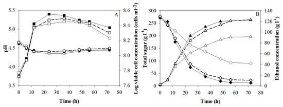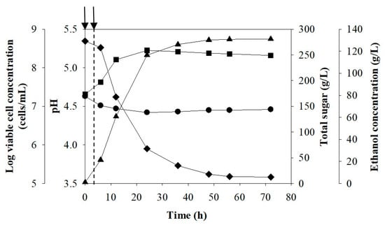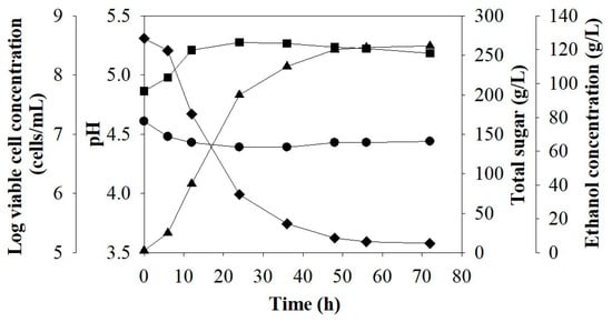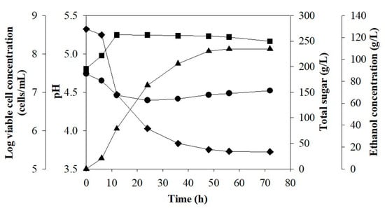 Figure 1 shows the main parameter changes during ethanol fermentation of Run 1 (Table 1). No lag phase was observed, indicating that the yeast cells were very active. Total sugar concentration decreased from 273.6 to 38.0 g/L after 56 h, whereas viable cells increased from 4.1 × 107 to 3.1 × 108 cells/mL in 12 h and slightly decreased after 36 h to 2.1 × 108 cells/mL at 72 h. The lower cell concentrations might have been due to high ethanol concentrations. This is in agreement with Bai et al. [], who reported that during ethanol fermentation, yeast cells were negatively impacted by high ethanol concentrations and its corresponding inhibition of yeast cell growth, particularly under VHG conditions.