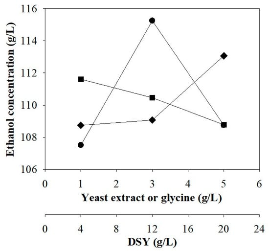 Ethanol concentrations at various levels and factors in the orthogonal array design (OAD) test (● = yeast extract, ■ = DSY, ◆ = glycine, DSY = dried spent yeast).