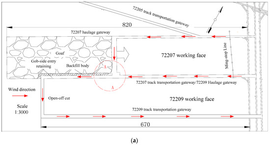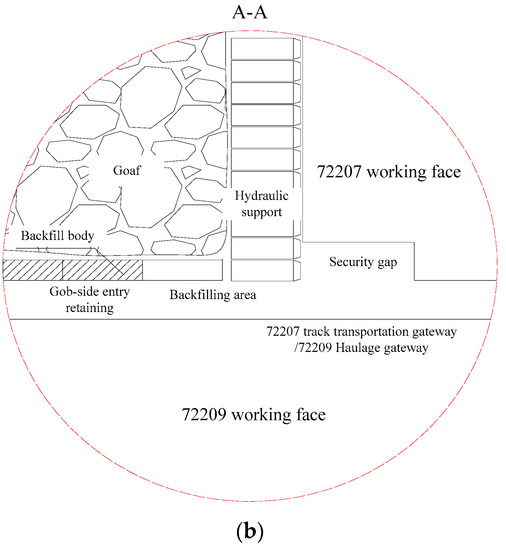 Figure 1. The plane view of the 72207 working face. (a) Schematic diagram of 72207 working face (b) A-A Profile.