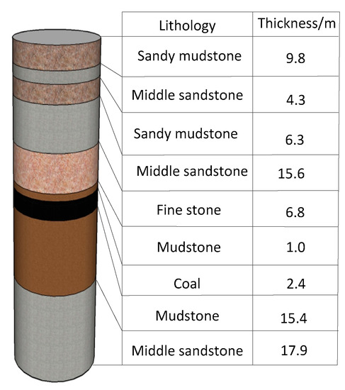 The #7 coal is a black brittle, fragile, and semi-black briquette. The coal thickness in the 72207 working face varies little, with an average of 2.4 m. The average dip angle is 17°, the gas content is 0.082–0.41 cm3/g, and the ground temperature is 31–37 °C. The direct roof in the 72207 working face is 1.0-m-thick mudstone, the main roof is fine sandstone with an average thickness of 6.8 m, and the direct floor is 15.37-m-thick mudstone. The lithologic information of the 72207 working face is shown in Figure 2.