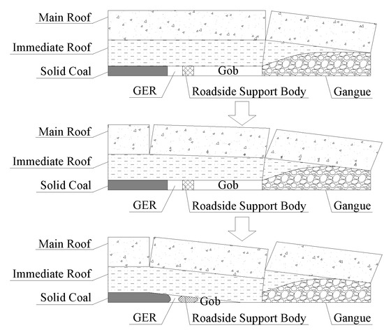 The hard roof strata of the 72207 working face should remain intact and hang above the gob. With the advancement of the 72207 working face, the size of the hanging area will increase. The roof strata will bend and subside when the hanging area reaches a certain value, imposing large pressure on the roadside backfill body and the surrounding rock mass. The gob-side retaining entry would be subject to large deformation and might be closed. The safety of the retaining entry cannot be guaranteed. The roof strata will break and cave in the gob area when the area of the hanging roof strata exceeds the limit value, causing severe dynamic pressure. The hanging roof strata and large pressure primarily occur in thick and hard roof strata. The evolution of large pressure in the hard roof strata is shown in Figure 3.