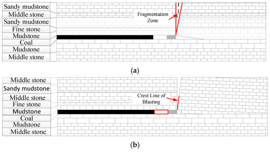In order to avoid the large deformation of the retaining entry and other dynamic disasters, measures such as deep-hole pre-splitting blasting and shallow-hole circulation blasting should be taken to weaken the hard roof strata. The length of the drilling hole for deep-hole pre-splitting blasting is usually larger than 20 m, and the drilling process is complex. Shallow-hole blasting is applicable in mines having a low gas content. Shallow-hole blasting is carried out in the gob-side temporary supporting area to form the pre-splitting line in the roof. The immediate roof will break and fall firstly. Afterward, the main roof will break and cave into the gob along the pre-splitting line (Figure 4b). The principle of shallow-hole blasting is to reduce the integrity of the hard roof in the gob side and to enable a certain height of roof strata to break and cave into the gob. With the advancement of the working face, the overlying roof strata will break along the pre-splitting line and the backfill body will support the remaining roof strata. This will ensure the stability of the roof strata above the retaining entry and reduce the pressure on the roof strata above the retaining entry. The retaining entry can be well retained, and it can be used to serve as the next working face. UDEC (Universal Distinct Element Code) was used to demonstrate the behavior of overlying roof strata before and after shallow-hole blasting (Figure 4).