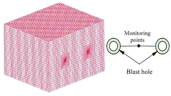 Numerical analysis using the nonlinear dynamic analysis software LS-DYNA was carried out to analyze the influences of the borehole spacing on the blasting effects. The ALE (Arbitrary-Lagrangian-Eulerian) method and multi-material fluid–solid coupling method were adopted when establishing the numerical model [25]. The measuring points were set in the middle point of the two holes to monitor the variation of the effective stress within the rock. The model size was 6000 mm × 5000 mm × 5000 mm, the hole diameter was 42 mm, the diameter of the explosive cartridge was 27 mm, and the depth of the hole was 5000 mm, as shown in Figure 6.