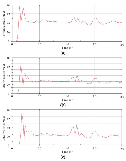 The effective stress curve at the monitoring points was obtained for different hole spacings of 0.8 m, 1.0 m, and 1.2 m using the post-processing module LS-PREPOST (Livemore software of pre and post-processor in LS-DYNA, as shown in Figure 7.