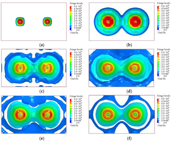 Figure 8. The evolution of the effective stress in the rock at the hole spacing of 1.0 m: (a) 39.886 μs; (b) 139.84 μs; (c) 299.51 μs; (d) 619.09 μs; (e) 1039.5 μs; (f) 1999.9 μs.