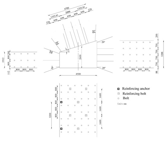 The roadway in the 72207 working face has a width of 4500 mm and a centerline height of 2600 mm. The support arrangement for the roadway in the 72207 working face is schematically shown in Figure 9. Rock bolts of 22 mm in diameter and 2000 mm in length and cable bolts of 18.9 mm in diameter and 5200 mm in length were installed to support the roof strata. The rock bolts used for the rib support of the roadway were 20 mm in diameter and 2000 mm long. Additional cables of 18.9 mm in diameter and 5200 mm in length were installed in the roof strata at the backfill body side at a spacing of 1200 mm.