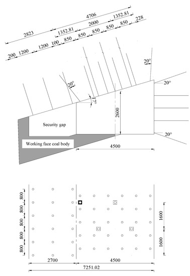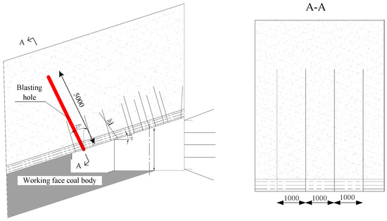 The mining height M = 2.4 m and the rock’s expansion coefficient K P = 1.5 were substituted into Equation (4), giving H = 4.8 m. Based on the theoretical analysis and the author’s field experience, the design hole depth was selected as 5.0 m in order to achieve the designed blasting effects. The inclination angle to the gob side of 10° was selected to facilitate the drilling process and the subsequent roof strata caving.