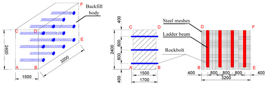 Figure 12 schematically shows the reinforcement diagram for the backfill body. In order to improve the resistance of the backfill body to deformation, special rock bolts which can be pretensioned from both ends were placed inside of the filling bag before the addition of the super-high-water materials, as can be seen in Figure 12. Pretensions were applied at both ends of the rock bolts after the backfill body hardened, which could further increase the strength of the backfill body. The rock bolts used in the backfill body were 22 mm in diameter and 1.7 m long. A steel mesh and a beam were also used to reinforce the backfill body. It was concluded that the presented results form the basis for a future longwall for which maingates can be maintained more efficiently.