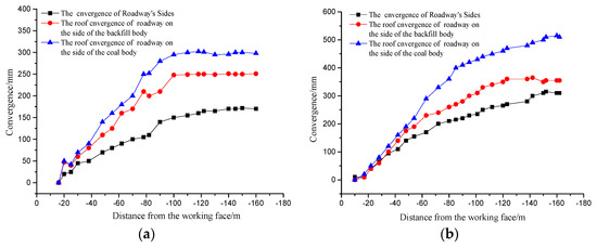Figure 14. The deformation of the gob-side retaining entries for the 72207 and the 72201 working faces: (a) the amount of surrounding rock moving in the 72207 working face rail roadway; (b) the amount of surrounding rock moving in the 72201 working face rail roadway.