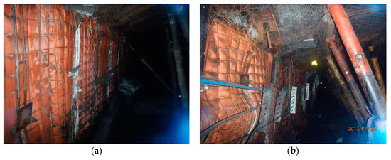 To prevent the excessive deformation of the roadway, hydraulic props and steel beams were installed in the roadway between 120 m behind the working face and 20 m in front of the working face (see Figure 10).