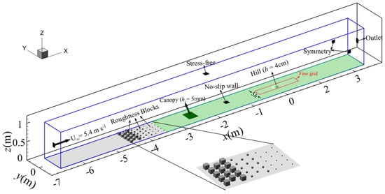 Configurations of the numerical model. The volume enclosed by solid blue lines is the computational domain and the area enclosed by the red dashed rectangular is the fine grid region, 5 h in width and 30 h in length. The original point (0, 0, 0) of the model is at the center of the fine grid, where the hill with a height of 40 mm is mounted. The solid dark squares with arrows indicate the boundary conditions. The green area indicates the regions with a vegetation canopy cover.