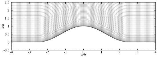 For the grid size, in the vertical direction, the grid was stretched starting with a vertical grid spacing of 0.2 mm on the surface in both the fine and coarse grid domains. The resulting vertical grid resolution on the surface < 1.0 covered most of the domain, except for the windward part of the hill where the maximum was less than 2. The vertical grid should be also sufficiently fine enough to capture the turbulent flow fields induced by the large wind shear, which was located at the height of about h. The vertical size of the wind shear-induced eddies is proportional to the shear length-scale Ls = U(z)/[dU(z)/dz], where U denotes the mean streamwise velocity. From a pre-modeling of the case with = 10 mm in the shear layer region, Ls was found to be nearly 8 mm. In the present LES, was finally set to be 4 mm at = 80 mm. In the region < 80 mm, the vertical grid was increased by a hyperbolic function. Exceedingly large aspect ratios () may cause numerical errors in the horizontal direction and some distortions of the eddies. The value of 10 was adopted in the present LES. Given , and in the fine grid domain should be about 2 mm. Moreover, in the grid independence examinations, the models with = 5.65, 4.0, 2.8, and 2.0 mm were calculated. The meshes = 2.8 and 2.0 mm gave roughly the same results, suggesting the grid-independent results were achieved. From this result, we got a more convincing conclusion, that is, in the LES of the current research field, the aspect ratio can very well estimate the actual situation of the turbulent structure on the 3D hill. Thus, a grid size 2.0 mm in horizontal direction was applied in the fine grid region. Finally, the corresponding nondimensional grid resolutions of fine domain in x, y, and z directions were = [3.2, 23], = [3.2, 23], = [0.23, 1.9]. Downstream of the fine grid domain and upstream of the roughness blocks, was stretched at a ratio of 1.2. Total grid number was 2.6 × 107. The vertical slice showing the grid distribution is provided in Figure 2. The mean skin friction coefficient was determined as: