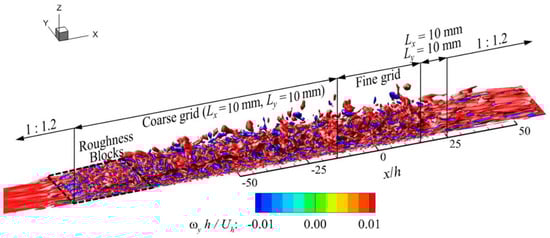 Accurately modeling the inflow is essential for the success of simulating the flow in the 3D hill wake. In the present study, the upstream blocks arrangement in the simulations were identical to those in the experiments by Ishihara et al. []. Besides this, the distance between the roughness blocks to the location where the 3D hills were placed was also set identically to that in the wind tunnel experiment. The additional drag force is used to simulate the roughness elements: