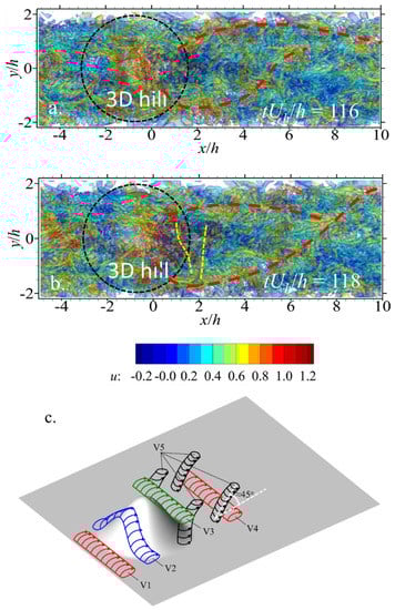 The iso-surfaces were then colored by the normalized instantaneous streamwise velocities. The red dashed line represents the main vortex core downstream of the hill. Obviously, a pair of vortices sheds from the lateral sides of the hill. Also, the energy of the shedding at each lateral side of the hill seems to vary periodically, forming a Karman vortex street, as usually observed in the wake of bluff bodies. In addition to the shedding from the lateral side, some spanwise vortices shedding from the crest, indicated by the yellow dashed lines, can also be identified. These vortices are primarily due to the ejection of the flow from the hill top and the Kelvin–Helmholtz instability. The lateral shedding and the spanwise vortices at the upper boundary of the wake yield an area with quite small velocities and weak vortices, leading to the formation of a dead flow area. Reviewing the depictures of the averaged vorticities and connecting the visualization of the instantaneous flow fields, the mean coherent structures of the flow over the hill covered by vegetations can be sketched in Figure 6c, where V1 and V4 are the canopy-induced vortices, V2 is the vortex distorted by the topography, the vortex caused by the ejection-sweep motions is indicated by V3, and V4 are the vortices shedding from the lateral sides of the hill.