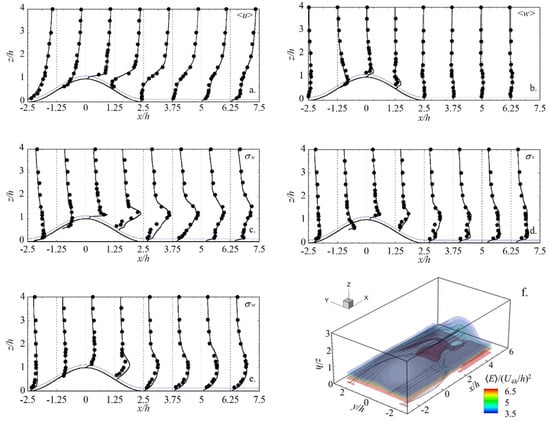 Vertical profiles of: (a) normalized mean streamwise velocity, ; (b) normalized mean vertical velocity, ; (c) normalized r.m.s of fluctuating streamwise velocity, ; (d) normalized r.m.s of fluctuating streamwise velocity, ; (e) normalized r.m.s of fluctuating vertical velocity, , at x equals to −2.5h–6.25h with a step size of 1.25 h. The unit in the x-axis represents the unit in the plotting of and , and 0.2 in the plotting of , and . The solid lines are from the present LES and the circles are from the wind tunnel experiment by Ishihara et al. []. The averaged three-dimensional flow structures are shown in Figure 7f by the normalized mean enstrophy with the mean streamlines superimposed. The blue solid line indicates the canopy top. x, y, and z axes have been normalized by h.