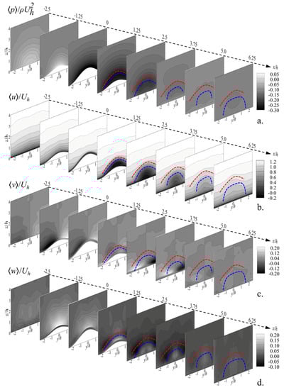Distributions of normalized (a) averaged pressure, ; (b) averaged streamwise velocity, ; (c) averaged spanwise velocity, ; (d) averaged vertical velocity, , on the slices of x = −2.5h–6.25h with a step size of 1.25h. The width of the slices is 5h centering at the y = 0, and the height is 4h. The red dashed lines represent the upper boundary of the wake and the blue dashed lines indicate the center of the shear layer. x, y, and z axes have been normalized by h.