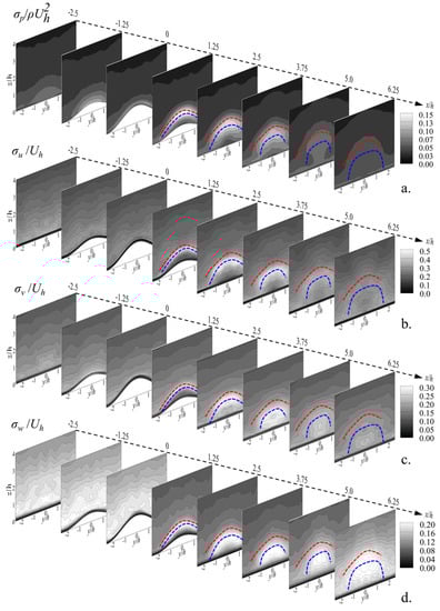 Similar distributions can be detected for , , and , as shown in Figure 9. The concentrations of , , and in the shear layer are obvious. However, the distributions for are distinct, whose peaks are centered just below the shear layer center. In addition, it is worth mentioning that and suddenly increase at the upwind footage of the hill, revealing the presence of a horseshoe vortex. This horseshoe vortex was also identified in the smooth 3D hill case in the study by Liu et al. [], implying that the disturbance of the flow from the canopy cannot eliminate the formation of the horseshoe vortex due to the topography.