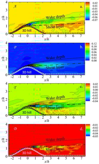 Their distributions on the slice of y = 0 are shown in Figure 10. The dominant term was found to be the turbulence production. A formula based on a turbulence generation term, this value is primarily determined by the shear of the average flow. Moreover, kinetic energy is generated in the opposite direction of the Reynolds stress, which not only eliminates the kinetic energy of the average flow, but also transfers the kinetic energy that is eliminated to the fluctuating velocity fields. Therefore, it is apparent that the maximum of the shear production P is at the entry of the flow into the hill wake, where a sudden flow ejection occurs and the shear layer begins to develop. Apart from the concentrations of the turbulence production in the shear layer region, a secondary concentration of P can be identified at the canopy top. The production P and dissipation D are directly responsible for the gain and loss of k in the transport equation, respectively. It can be seen that the dissipation is negative in the global process. This is because the turbulent dissipation acts as a sink for the TKE budget. It can act as a resistance to fluctuating stress and can also convert kinetic energy into internal energy. Interestingly, different from P, the concentration of D is observed at the locations just below the shear layer. Moreover, there are abruptly no dissipations above the shear layer, revealing the much more organized instantaneous turbulence structures here. The secondary dominant term is A. It is negative in the shear layer but positive in the wake core region, whose distribution is similar to the turbulence transportation term.