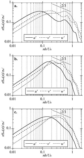 One-dimensional pre-multiplied spectra of three velocity components , , and at the monitoring points: (a) P1; (b) P2; and (c) P3. The pre-multiplied spectra , , and are further normalized by , , and , respectively, and the frequency n is normalized by Uh/h. The inclined lines with a slope of 2/3 are drawn to show the inertial subrange of the spectra.