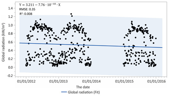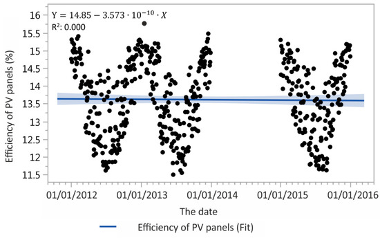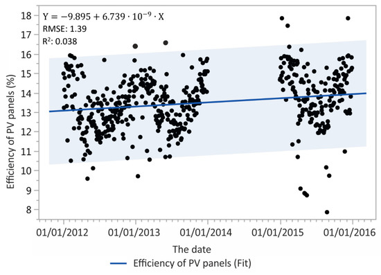 In our case, we have observed the rate of degradation (determined through the calculated efficacy) caused by age using a linear regression model, which is generally the accepted method [3]. The degradation rate is so low (in the order of 1 × 109) that it is impossible to determine because the changes in efficiency are within the statistical error and thus our results do not agree with the conclusions of the literature [5,8]. For midrange and polycrystalline PV panels, the degradation rates range from 0.3% to 2.9% per year [9]. However, from a level of 0.5% and above, manufacturers would not be able to guarantee the durability for 25 years [9] and above, or, as in our case, the manufacturer guarantees a maximum of 10% degradation in ten years. After the commencement of operation and alignment of components, it may be that there is also an occurrence in the literature that indicates an increase in efficiency in the first period after starting to use PV panels [5].