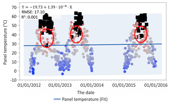 The temperature of the photovoltaic panel is influenced by global radiation, air temperature and other factors such as wind speed and hydrometeors. In the case of temperature evaluation, it is also necessary to consider the electrical resistance of the PV cells, which causes an increase in temperature when solar radiation is converted to electricity. This factor is the difference between the air temperature and the PV module operating temperature. The following figures (Figure 2 and Figure 3) provide an overview of the operating air temperature and the temperature of the PV modules over the period under investigation, where the interaction of the two parameters can be seen. The graph shows the influence of wind on the temperature of PV modules in the absence of GR. These are sections where the temperature of the PV modules is lower than the ambient air temperature (see Figure 3; black dots in the marked elliptical formations).