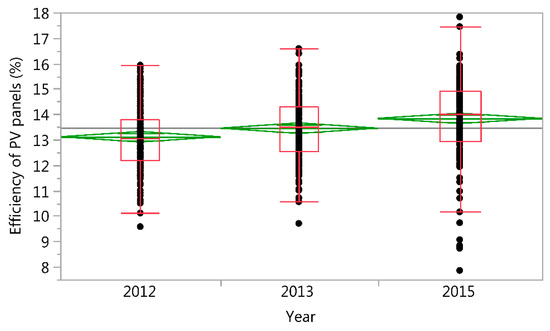 This non-standard development of efficiency identified the need to investigate year-on-year variability in efficiency using the ANOVA. The average annual efficiency values are shown in Figure 5 and Table 3. The ANOVA average annual efficiency values show that the overall average efficiency is 13.47%. The annual efficiency values show significant statistical differences between them. The results highlight above-average efficiency values in 2015 and below-average efficiency values in 2012.