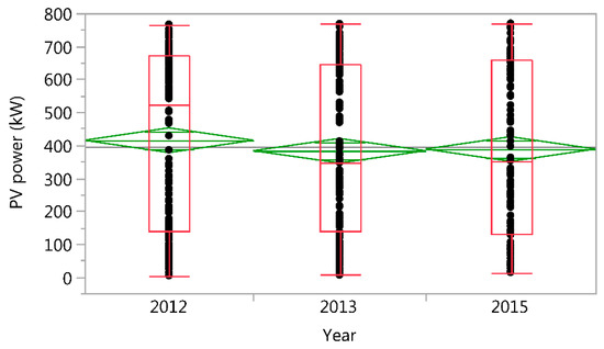 This decrease includes both the degradation of the photovoltaic panels as well as the close coupling to the decrease in the intensity of incident radiation. The analysis of variability shows a certain stability of the achieved power during the analyzed years (see Figure 7 and Table 4).