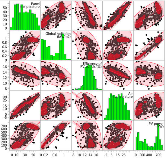 Using multivariate analysis of data dependencies and individual numerical values, we evaluated the relationship between input data (intensity radiation and air temperature) and output data (temperature, performance and efficiency of photovoltaic panels). The result of the analysis showed a very strong positive relationship with a Pearson correlation coefficient of greater than 0.9 between the panel temperature and the air temperature, as well as between global radiation and panel performance. Using analysis of pairwise correlation, we have studied the relationship between all pairs of variables, which in all cases was confirmed to be statistically significant (see Figure 8 and Table 5). Positive dependence was found in six pairs and negative dependence in four pairs. In the case of a negative dependence in each pair, an indicator of the efficiency of the PV modules is output, which is the subject of further investigation.
