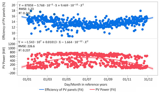 In the next step, we will focus on evaluating the efficiency and power of PV panels. Pearson’s correlation coefficient in Figure 8 shows a weak negative linear dependency rate. Power panels should decline and decrease the intensity of the incident radiation as expected. However, efficiency increases significantly. When comparing the course of efficiency and power of PV panels over the year (Figure 9), it is possible to observe the efficiency of the panels, which is described by the quadratic regression function. The highest efficiency values are in the cold/winter months and the lowest in the summer, which is also due to the temperature of the panels. The behavior of the power of panels over the year can also be approximated by a quadratic regression function, but the deviations/residues from the function are significantly higher; the power values vary from 0 kW to 800 kW throughout the year.