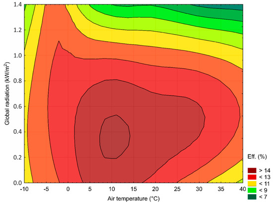 If we look at the area efficiency graph (Figure 10) in relation to the air temperature and the intensity of incident radiation (which was obtained by the method of least squares), we can see the following: the highest efficiency values were achieved at an air temperature of 7 °C to 14 °C and an incident radiation intensity of 0.2–0.5 kW/m2. Above-average efficiency values range from an outside temperature of −5 °C to 35 °C and a global radiation of up to 1 kW·m−2.