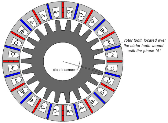 Assume that an FSG rotor tooth is over the middle of the stator tooth wound with the phase ‘A’, as shown in Figure 1. Since the teeth number and the pitches of rotor and stator are approximately equal, and the stator tooth wound with the phase ‘C’ is two stator pitches away, there is a rotor tooth located two rotor pitches away from the first rotor tooth, approximately over the middle of the stator tooth wound with the phase ‘C’. In fact, because of the difference between the rotor and the stator pitches, there is a displacement (Figure 1) between the middles of the rotor tooth and the stator tooth wound with the phase ‘C’ equal to that is equal to one-sixth of the electric period or 60 electric degrees. Therefore, the FSG is symmetrical with respect to the rotation of the rotor by a one-sixth of the electric period and the phase permutation . Thus, considering the interval of one-sixth of the electric period is enough. In this paper, this interval was divided into 15 equal parts. The number of the boundary problems to solve was 16; 14 of them were inside the interval, and 2 were at its ends.
