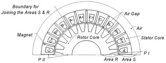 Besides, the flux-switching machine (FSM) symmetry as a whole with respect to a rotation by 180° allowed reducing the calculation area by twice (Figure 2). In this paper, one and the same calculation area was chosen for all boundary problems. The calculation area was divided into two subareas at the middle of the air gap. The rotor position was taken into account by joining these subareas by the boundary condition depending on this angle. Thus, the stator and rotor fields were calculated in their own reference frames. Boundaries P I and P II were joined by the periodic condition [12].