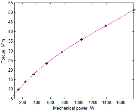 We determined the two-mode and three-mode substituting profiles. The required averages calculated under the initial profile (Table 1) according to Equation (3) are given in Table 2. The mechanical powers in the underload modes and their probabilities were determoned by Equations (8), (9), (10). Figure 3 shows the torques and the mechanical powers at nine modes in the initial profile, with ‘*’ as well as the cubic polynomial approximating this dependence. Then, the torques of the substituting profiles were determined using this approximation. After that, the rotation speeds were calculated (Table 3 and Table 4).