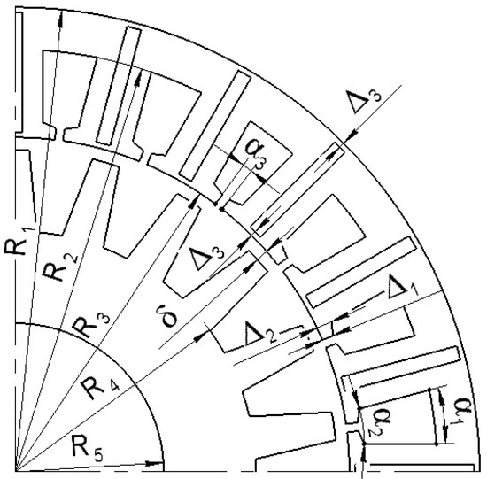 Figure 4 shows the main geometric dimensions of the FSG. The FSG parameters fixed during the optimization are given in Table 5. The angular dimensions of the stator are given in the stator tooth pitch, , and those of the rotor are given in the rotor tooth pitch, . The parameters that varied during the optimization are given in Table 6. To reduce the reactive power, the field-weakening technique was applied. The current angle was assumed to be proportional to the torque; the zero angle of the current was chosen when there was no field weakening.