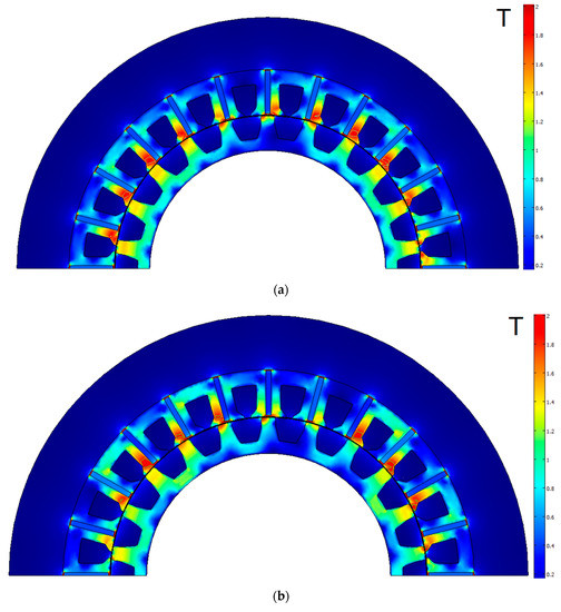 Flux density plot of the initial FSG design: (a) underload mode of the two-mode profile; (b) rated mode.