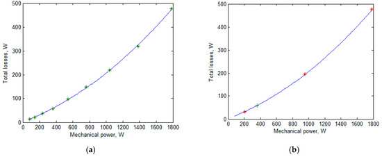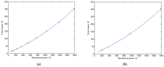 The FSG losses for the two-, three-, and nine-mode profiles are given in Table 7. The mechanical losses were assumed to be equal to . The average losses for the two- and nine-mode profiles almost coincided (the difference was less than 0.03 W). The average losses for the three-mode profile differed from the previous ones by 0.1 W. To be sure that the coincidence of the numeric values of the losses was not accidental, the nine modes of the nine-mode profile are shown with ‘*’ in Figure 6a; the quadric trinomial approximating these modes is also shown. The same parabola is shown in Figure 6b. Also, the modes of the three-mode profile are shown with ‘*’, and the underload mode of the two-mode profile is shown with ‘+’. The figures show that all these modes were approximated well with the parabola. Therefore, the approximation was carried out under the two-mode profile in this work.