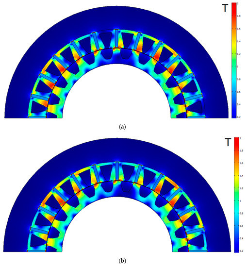 Figure 7 shows the geometry of the FSG optimized design and the magnetic flux density at the rated mode and at the underload mode of the two-mode profile. Thin green isolines of 1.85 T were added to the picture to show the areas of extreme saturation. Compared to Figure 5, the magnetic flux density did not reach 1.95 T, except for the stator ribs. Also, the volume of the extreme saturation of the stator core was significantly diminished during the optimization. The yoke thickness R1 − R2 was reduced. The stator teeth thickness narrowed at the base and thickened near the air gap.