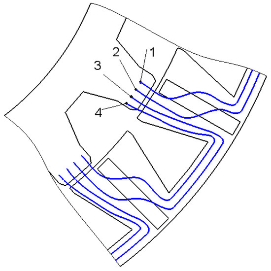 Figure 8 clarifies such pattern. When the rotor tooth is over the half of the stator tooth, the magnetic flux flowing into this half and shown with the magnetic field lines 1, 2, 3, 4 closes through the yokes and splits into two fluxes, i.e., 1, 2 and 3, 4. To conduct such fluxes, a yoke thickness approximately equal to the half of the half of the stator tooth is enough. Besides, the flux 1, 2 crosses the magnet to another part of the stator tooth uniformly and almost weakens fully at the stator tooth base. Therefore, the thickness of the half of the stator tooth at its base is approximately equal to the yoke thickness. These geometric ratios can be slightly broken in the optimal design of an FSM with rare-earth magnets. However, they can be used to get a good initial design for optimization.