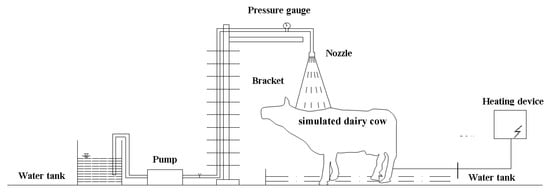 An experimental platform was built to simulate the different summer environment and spraying conditions in the laboratory for dairy cows (Figure 1). The experiment platform was composed of three parts, namely spraying system, heating system, and environment control system. The spraying system provided spraying simulation of the practice, and it included a water pump, a pressure gauge, a flow meter, a control valve, and a pipeline connecting unit. The heating system provided an inner heat source to simulate the body temperature dairy cows. The environmental control system adjusted the experimental temperature and humidity in order to create high temperature and humidity environmental conditions.