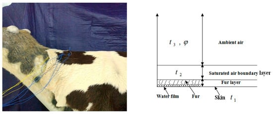 Typically, the cooling efficiency of the neck of cows is higher, which is considered as an area with good heat dissipation. Thus, measuring points of skin temperatures () were set on the neck [20], and another point above the skin was selected to monitor the air temperature in the saturated boundary layer (). The air temperature and humidity (, ) of the main stream were monitored by using the temperature and humidity HoBo sensors (Figure 3).