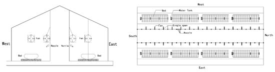 The right side of the barn was set as the treated area (Figure 5a). Based on the test for optimal ADSD in the laboratory, the nozzles with models of 9080 and 90100 were replaced in the area. The nozzles were located 0.3 m above the headlocks on the water supply pipe. The distance between adjacent nozzles was 1.2 m (Figure 5). In the field experiment, the pressure of the spray pipeline was 0.1 Mpa, under which the ADSD of the two nozzles was 0.947 and 1.127 mm, respectively. The spraying system was cycled with 2 min on (water spraying) and 5 min off (ventilating).